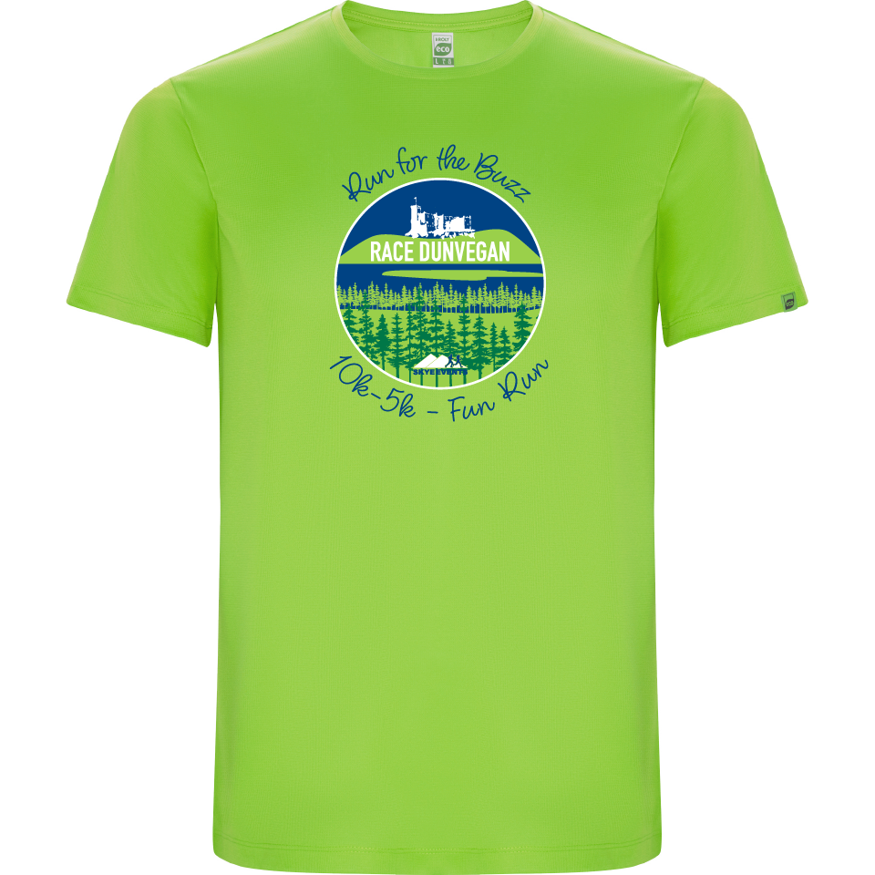 Eye-catching vibrant blue or lime green bespoke eco t-shirt for anyone who's run for fun or completed a 5k or 10k in Dunvegan - with slogan "Run...That's When the Magic Happens" or "Run for the buzz".