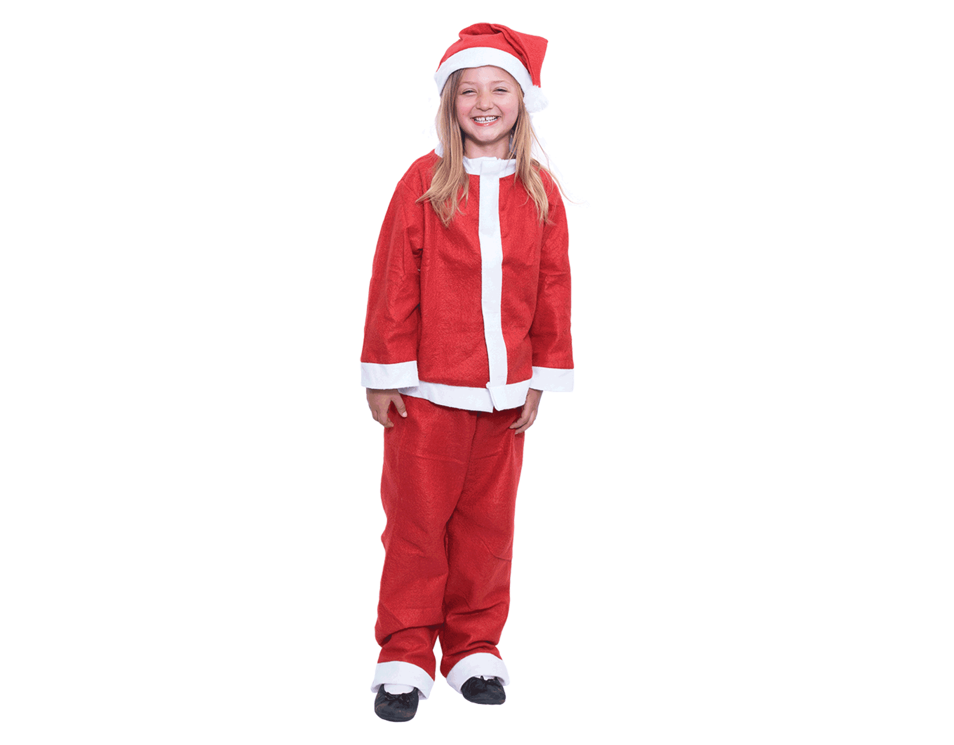 CHILD SANTA SUIT: Our child Santa gear includes a red velcro fastening Santa Suit jacket, red Santa trousers and a red Santa Hat and are sized as follows: Jacket: Length 56cm, Shoulder 42cm, Chest 47cm, Sleeve 42cm. Trousers: Length 86cm, Waist 50cm